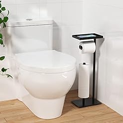 Susswiff Free-Standing Toilet Roll Holder with Top Storage Shelf, Black Toilet Paper Holder Stand, Floor Standing Toilet Roll Dispenser Storages 4 Reserve Rolls