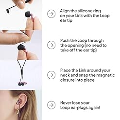 HOW TO USE – 1) Align the silicone ring on your Link with the Loop ear tip. 2) Push the Loop through the opening (no need to take off the ear tip). 3) Place the Link around your neck and snap the magnetic closure into place to keep your earplugs secure!