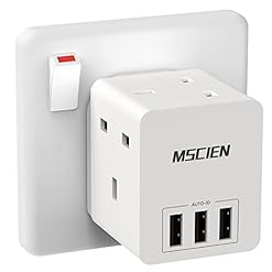 Mscien Plug Adapter UK, 3 Way Plug Extension With 3 USB, 13A Multi Plug Adaptor Wall Charger, Small Cube Power Socket for Bedroom, Office, Kitchen, White