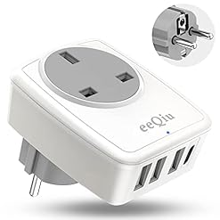 UK to EU Euro Europe Plug Adapter with 3 USB and 1 USB C Ports, eeQiu Euro Travel Adapter 5 in 1 Grounded European Power Plug with USB for France Germany Spain Greece Portugal and More (Type E/F)