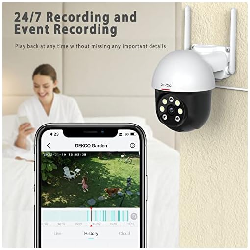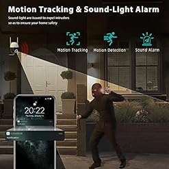 Auto-Track & PIR Humanoid Detection — DEKCO security camera outdoor will automatically rotate to track the humanoid object in motion, then record real-time video or pic. The camera can trigger sound-light alarm when detecting a person in motion, and meanwhile app notification will be sended. Detecting area and sensitivity are free to set or turn off.