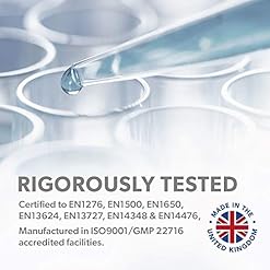 Complete broad spectrum activity – Highly effective surgical grade proven formula is fully tested to EN 1276, EN 1500, EN 1650, EN 13624, EN 13727 and EN 14476 and proven to be antibacterial, virucidal and yeasticidal. Kills 99.999% of many common germs.