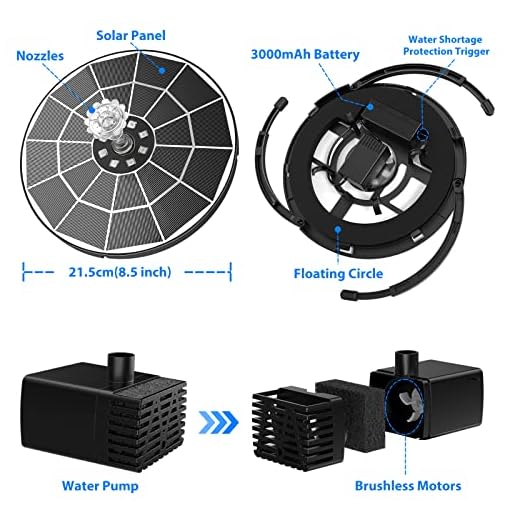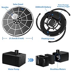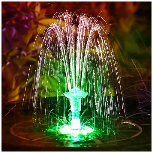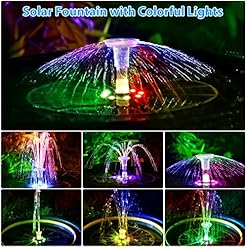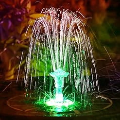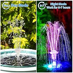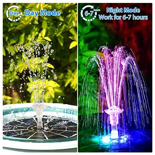 [Random Multicolor LED Lights] : AMZtime Solar Fountain Pump has a 3000mAh battery backup. Under the sunlight during the day, it is converted into electricity to support the solar water pump to work at night. As the night comes, the lights automatically turn on under the induction system, and 8 different RGB colors are displayed in a cycle, making your garden more beautiful and charming at night.