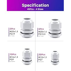 【Package Including】45Pcs cable glands. 20Pcs M12 × 1.5, 15Pcs M16 × 1.5, 5Pcs M20 × 1.5, 5Pcs M25 × 1.5.