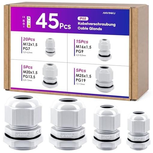 ANVINKU 45Pcs Cable Glands, Plastic IP68 Cable Glands Set, M12 M16 M20 M25 Locknut Stuffing Glands, Adjustable 3-15mm Cable Conduit for Garden, Outdoor Connector Glands