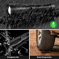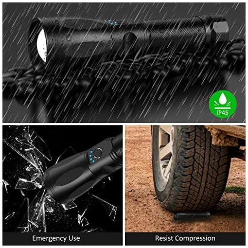 【LIFE-LEVEL WATERPROOF MATERIAL】: The high power torch is made of high quality metal alloy meterial. Skid-proof, explosion-proof and shockproof. The robust attack head made of aluminum can protect the convex lens from damage, and in emergencies it can also be used for self-defense.