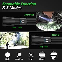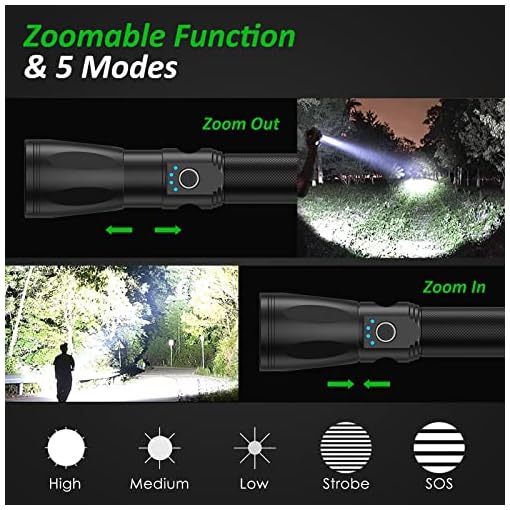 【5 LIGHT MODES | ADJUSTABLE FOCUS & IMPROVED SWITCH】 This high power led torch has 5 light modes (High | Medium | Low | Strobe | SOS). Wide to narrow-beam zoom makes it ideal for camping, hiking. When you are in danger,strobe light and emergency modes is suitable for emergency alarm effects,using the strobe light or emergency modes can help you seek help from people nearby.