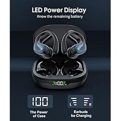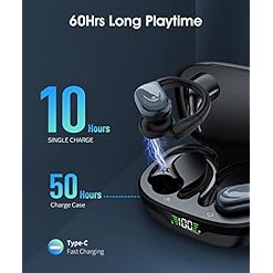 60H Playback and LED Digital Display:Single wireless earbuds can be use 10Hrs, up to 60Hrs of listening time with 5 additional charges from 650mAh battery capacity charging case. Charging case with a clear digital display, as well as the left and right sides with the earphones power display, each grid represents 25% of the power. During charging and connected, the LED light will flash.
