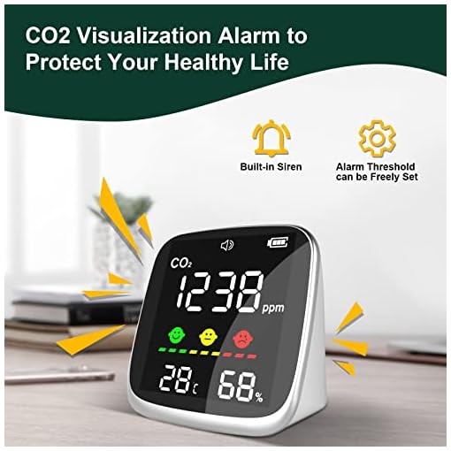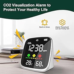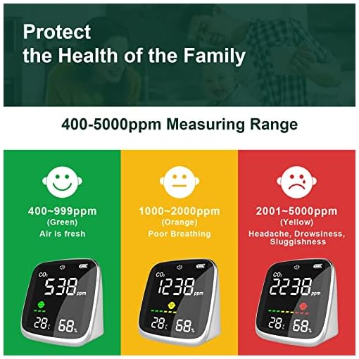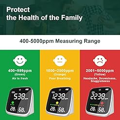 【CO2 Visualization】: Colour display: 400~999ppm Green (Safety) 1000-2000ppm Yellow (Warning) 2001-5000ppm Red (Exceeding standard). The indicator light that changes color according to the different degree of carbon dioxide concentration allows you to easily grasp the current state of carbon dioxide concentration in the air
