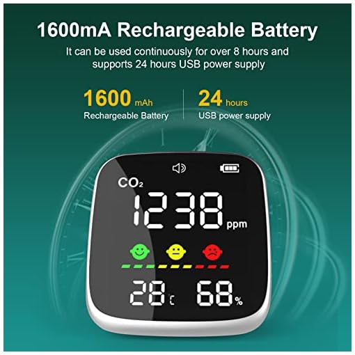 CO2 Detector, 10-Years Battery Life Indoor Air Quality CO2 Monitor Carbon Dioxide Monitor NDIR Sensor 400-5000 PPM, 1600 mAh USB Rechargeable CO2 Alarm Meter for Home, Office, Car, Gym