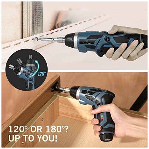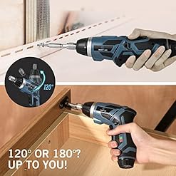 TWO HAND-HELD SHAPES SUPPORT: This cordless screw gun can be adjusted from 120° to 180°, which is more convenient to use. You can also easily tighten or unscrew the screws using the forward/reverse switch.
