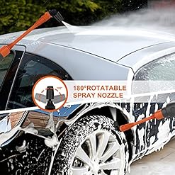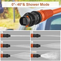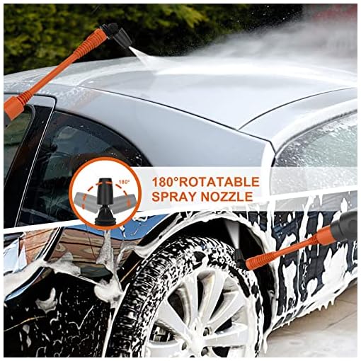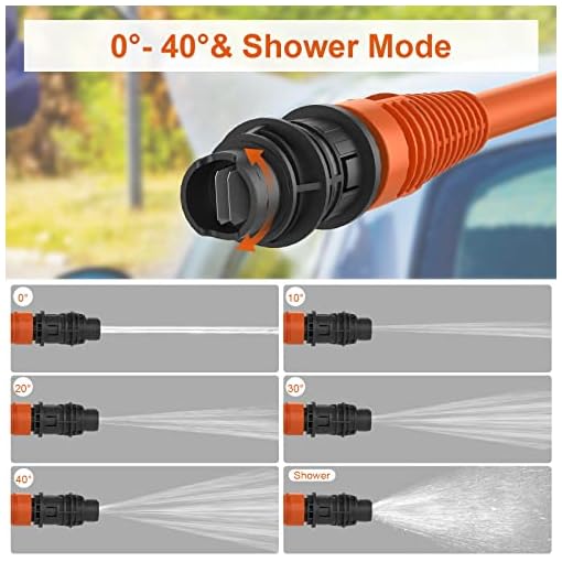 STEPLESS VARIABLE-ANGLE NOZZLE & ROTATABLE SPRAY NOZZLE: Upgraded nozzle with stepless adjustment from 0° to 40° and shower mode. Multiple spray patterns for multiple functions and applications. In addition, we also provide 180° rotatable nozzle for cleaning dirt on the roof and inside of the wheels. This cordless power washer makes your cleaning more convenient than others with interchangeable nozzles.