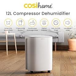 Cosi Home 12L/Day Dehumidifier – Low Energy Compressor Dehumidifier with 2.5L Water Tank for Damp, Mould, Condensation – Moisture Remover for Home, Kitchen, Bathroom, Office, Garage
