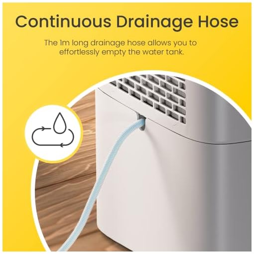COMPACT & PORTABLE – Fitted with 4 wheels for easy transportation, this portable dehumidifier can be easily stored away when not in use. The modern and sleek design will look great in any home or office. A 1m-long hose is also included for a continuous drainage option.