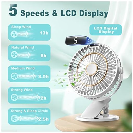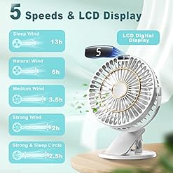 🍀5 Adjustable Speeds & Clear Display: New Desk Fan USB Rechargeable has 5 Adjustable Speeds, which can be controlled by tapping the switch on the top of the Clip on Fan to switch between Soft/Medium/Strong/Ultra Strong/Strong and Weak Wind to meet all your Cooling needs at any moment. The USB Fan comes with an LED Digital Display, which clearly shows the Fan’s Gear.