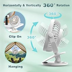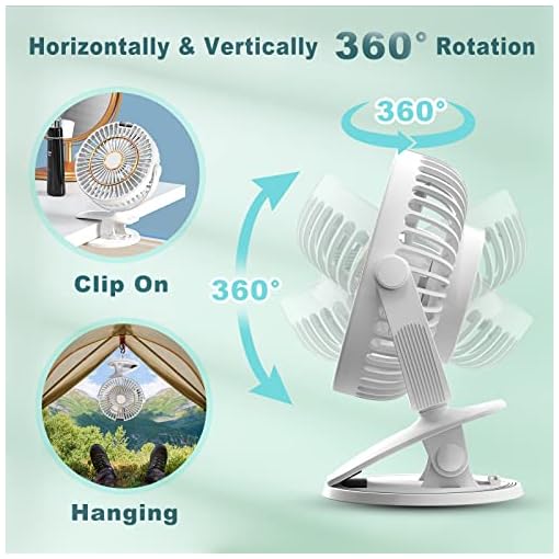 🍀720° Wide Angle Air & 3 Modes: This 6in USB Fan can Rotate 360° Horizontally and Vertically, can be Fully Rotated and Tilted to Any Angle, providing you with All-Round Coolness. Unlike ordinary Fans on the market, the COZII Clip Fan not only supports both Desktop and Clip modes, we have also designed the Hanging Holes in the base and included a hook in the package so you can hang the Desk Fan Portable to save more space for you.