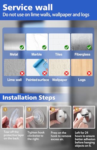 Available Wall Surfaces: Suction cup hooks are suitable for use on smooth surfaces such as glass, tiles, metal, marble, etc. Note that the hooks are not suitable for painted wall, lime wall, wallpaper.