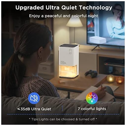 🌞【Auto Shut off & Colorful Night Lights】 The visualized 40 OZ (1200ml) water tank is easy to take out, clean. This mini dehumidifier will auto shut down when the water tank reaches full, and the red light will flash to remind. No worry about water overflow. 7 colorful lights provide the light you need when getting up at night. (Note: Colors can be steady on and turned off ).