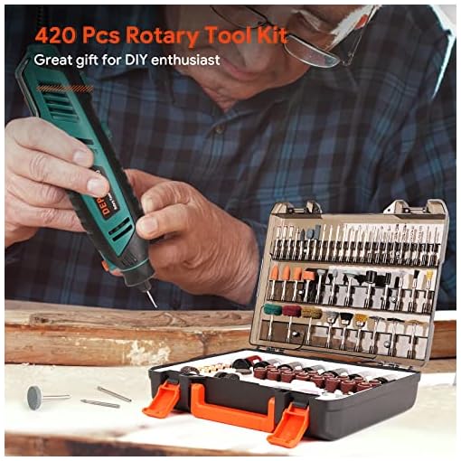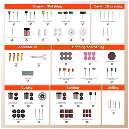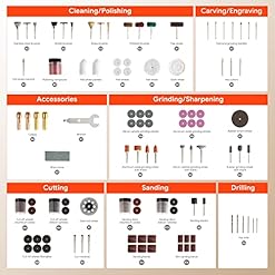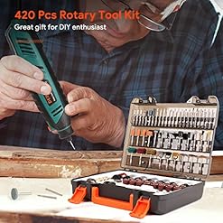 420Pcs Rotary Tool Accessories Kit: The 420Pcs accessories set comes with almost all the accessories you need to use for your DIY works. Include sanding bands, sanding discs, carving tools, cutting wheels, grinding needles, Hss cutter, flap wheels, steel wire brushes, mandrel, 4pcs collet, wrench, drill bits and more .