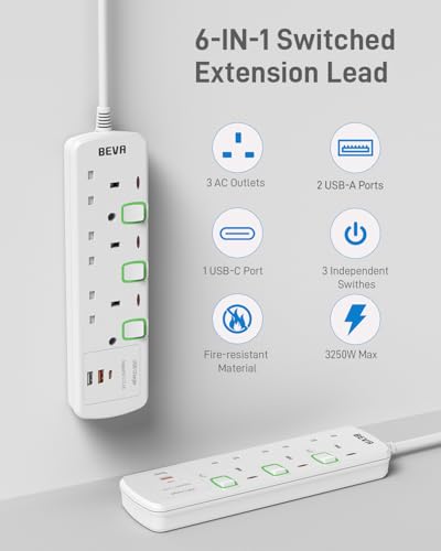 Extension Lead with USB Slots, BEVA 3 Way Plug Extension With 2 USB-A and 1 USB-C, Individual Switched Extension Socket Mountable Power Strip with 1.5M Cable