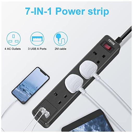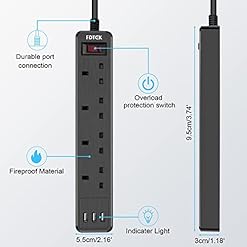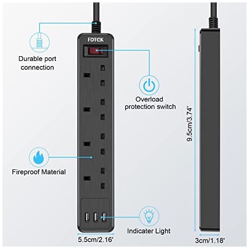 Extension Lead with USB Slots, FDTEK 4 Way Multi Plug Extension Socket with 3 USB Ports, Extension Cable 2M with Switch, UK Mountable Power Strip for TV PC Tablets Home Office Kitchen Black…