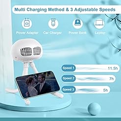 Rechargeable & Portable: This clip-on fan is equipped with a built-in rechargeable battery for a good battery life. Fully charge for 6 hours and can work up to 11.5 hours under breeze wind mode. The using time is about 11.5h at Speed 1; 7h at Speed 2; 5h at Speed 3) .The fan is quiet on the Speed 1 and quite strong on the Speed 3.