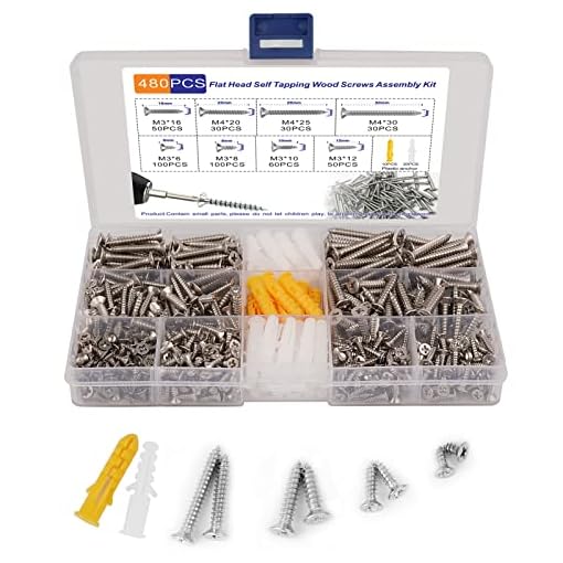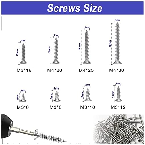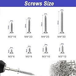 【WHAT YOU WILL GET】8 kinds of Phillips flat head tapping screws.Including M3*6mm(100pcs);M3*8mm(100pcs);M3*10mm(50pcs);M3*12mm(50pcs);M3*16mm(50pcs),M4*20mm(40pcs);M4*25mm(30pcs);M4*30mm(30pcs),Plastic anchor 30pcs,a total of 480pcs,to meet your daily needs.