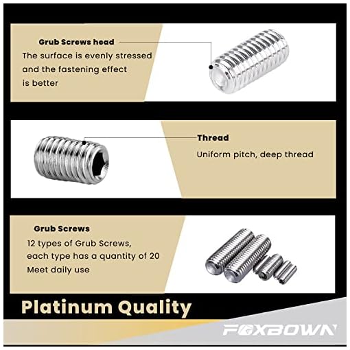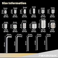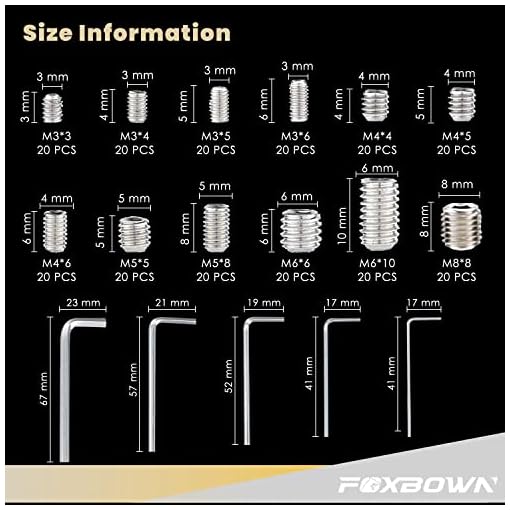 PACKAGE INCLUDE: You will get a total of 240pcs mixed grub screws, the size include M3*3, M3*4, M3*5, M3*6, M4*4, M4*5, M4*6, M5*5, M5*8, M6*6, M6*10, M8*8 having 20ps each, and 5pcs wrenches, which is enough for your daily use.
