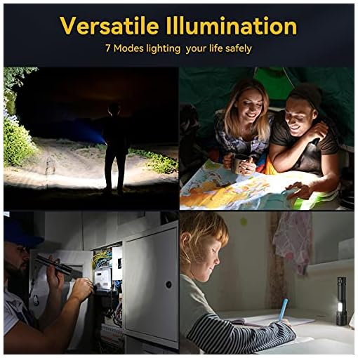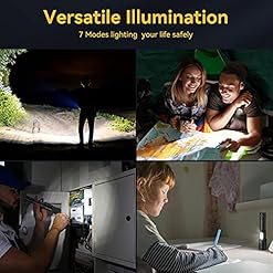 1.【Super Bright & 7 Modes】 Powerful 3000 lumen LED Torch with high-efficiency and great output LED chip,generates a brilliant large area floodlight or a perfect focused spotlight.Adjustable focus with 7 modes:(High,Low,Strobe,Side High,Side Low,Side Red,Side Red Strobe).Press twice to switch to side light mode, and long press for two seconds in any mode to turn off the torch.