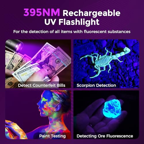395nm UV Torch Light: Provided 395nm wavelength Black light easier detection of dried pet urine stains, ultraviolet flashlight also can check if bills and banknotes have been counterfeited, and can help with antique appraisals.