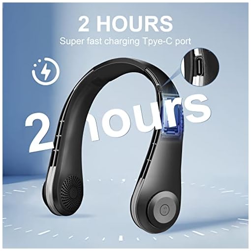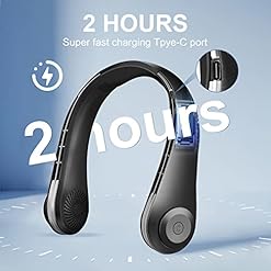 【Super Fast Charge】 Our neck fan charging port is a super fast charging port and takes only 2 hours to fully charge (with 2A charging current). The neck fan comes with a 50cm long USB Type-C charging cable (you can also use your own charging cable).
