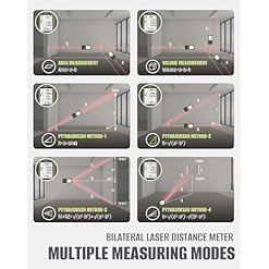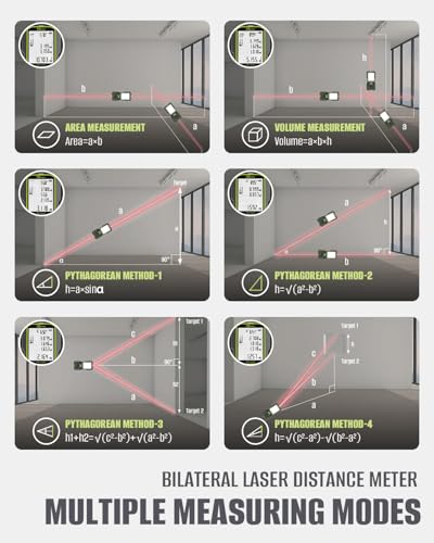 Multiple Measurement Modes: The laser distance meter offers a variety of measurement modes including continuous measurement; area and volume calculations; Pythagorean theorem for indirect height/width; and angle measurement. You can easily switch between bilateral and single laser modes, meeting the needs of both simple length measurements and complex volume calculations