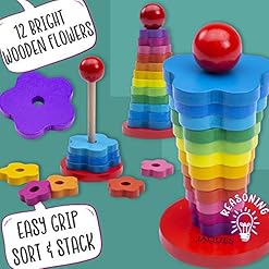 RAINBOW SHAPE STACKER | Your wooden shape sorter is the perfect baby toys for introducing colour and shapes, with 1 wooden pole stand, 12 stackable wooden flowers and 1 red sphere topper.