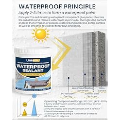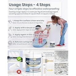 Clear Waterproof Sealant Usable Area: 2-3 even coats per 1kg of invisible waterproof sealant, covering approximately 14 square feet, 1.3 square meters. Waterproof anti-leakage agent can be applied by brush, roller, pouring, etc. Cross-apply, 24 hours between coats, for a long-lasting waterproof sealing membrane.