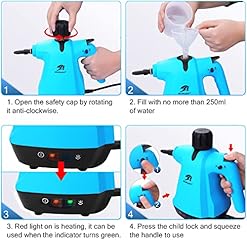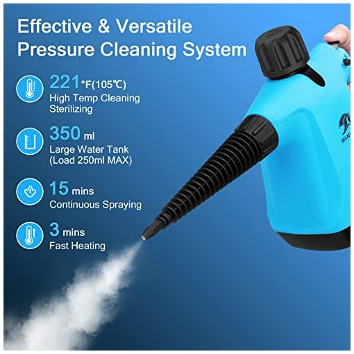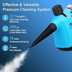 [350ML Volume Water Tank] Our steam cleaner handheld features a large water tank of 350ml capacity (recommended load capacity is within 250ml) which allows you to focus on cleaning, instead of refilling often. For 10 ~ 15 minutes of normal use. Cut through any grease, grout or stain with high-pressure steamer.