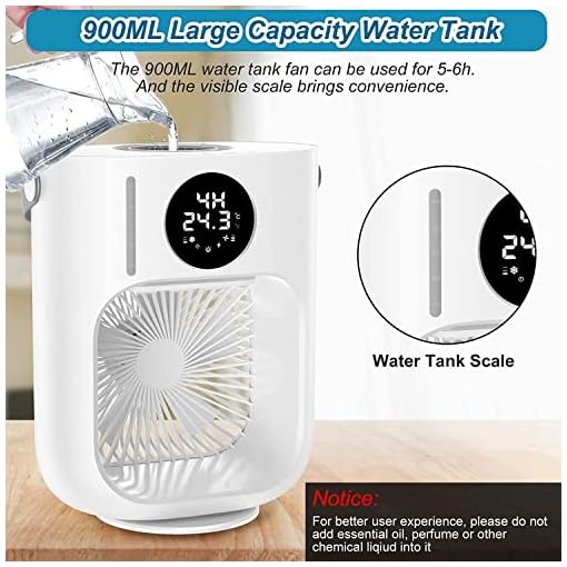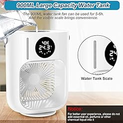 【Visible 900ML Water Tank】This air cooling fan has a 900ML water tank. When it is fully filled, the humidifier can run for 5-6 hours. With a water scale offered, you can clearly know how much water left. The air cooling fan will automatically turn off the humidifier function if it runs out of water, so you have no worry at all. For longer use, we recommend running water and mineral water to be added, and any essential oil, solvent and perfume should exclude.