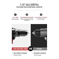 【13mm(1/2”) All Metal Keyless Chuck 】:The drill set uses an all-metal chuck that allows you to hold the drill or brush better in place without deflection, and the 1/2″ size allows for more tools to be held.