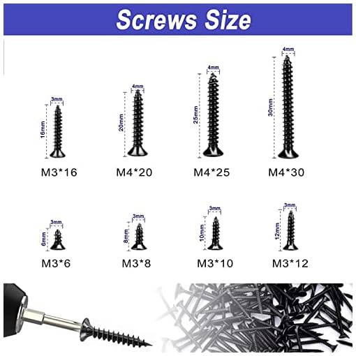 【WHAT YOU WILL GET】8 kinds of Phillips flat head tapping screws.Including M3*6mm(100pcs);M3*8mm(100pcs);M3*10mm(50pcs);M3*12mm(50pcs);M3*16mm(50pcs),M4*20mm(40pcs);M4*25mm(30pcs);M4*30mm(30pcs),Plastic anchor 30pcs,a total of 480pcs,to meet your daily needs.