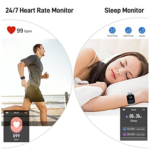 24/7Real Time Heart Rate and Sleep Monitor: Sports watch has heart rate, blood pressure, blood oxygen monitor functions, always paying attention to your physical health, but the data is just used for reference. And fitness tracker watch can track your daily activity data like steps, calories, distance and minutes active and generate data.This fit watch can also measure your sleep automatically, which helps you know awake, light, and deep sleep data and remind you to adjust your sleep habits.