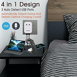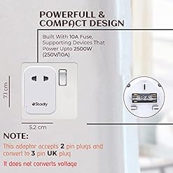 4 IN 1 Multi Travel Adaptor- 2 Pin Adapter Plug UK can extend a standard 1 two pin and 3 USB ports at a time, which is ideal for charging indoor without long Extension Leads. Equipped with a 10A fuse, with maximum capacity up to 2500W (250V/10A)