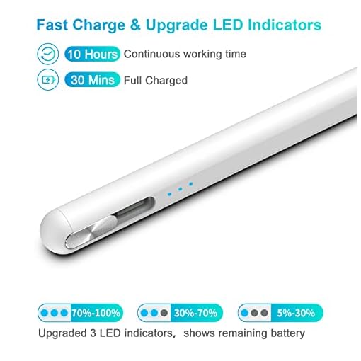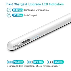 【2022 Upgraded Design】①Fast charge, Full charge in 30 mins; ②Upgraded 3 LED indicators, remaining battery power with just a glance; ③ Double tap to turn on/off, which prevents accidental turn off; ④ There is a slide dust cover with this pencil for iPad, specially designed to protect the charging port against dust, debris, moisture and grime