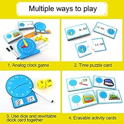 【Education & Fun Time learning toy!】This time clock learning toy set includes time dice, time puzzles, clocks, clock cardboard and time activity cards, etc..The children can learn and recognize the time concept from it, such as understand the different forms of time, analog clocks or digital clocks, realize the importance of time management since childhood, and get more fun in learning.