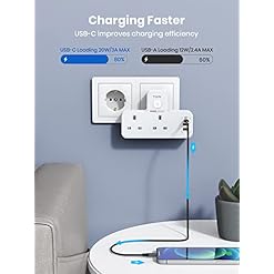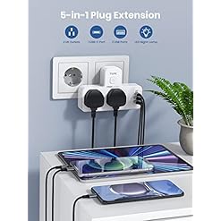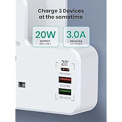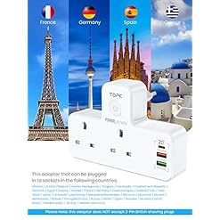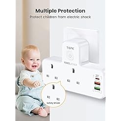 5 IN 1 Multi Plug Extension: TOPK multi plug adapter features 2 grounded AC outlet sockets and 3 USB ports (include 2 USB-A & 1 USB-C) , and also with 1 adjust LED light. One adapter for five devices.(Tips:For your safety, pls check the total wattage of all the devices doesn’t exceed 2500W when use adapter plug uk.)