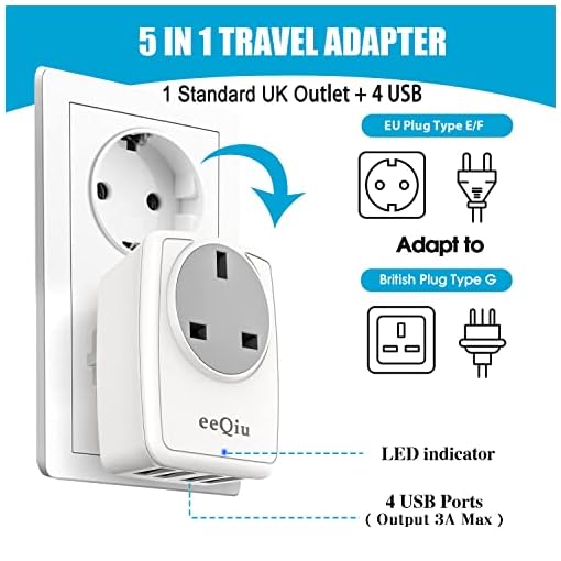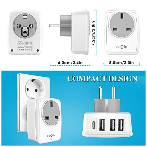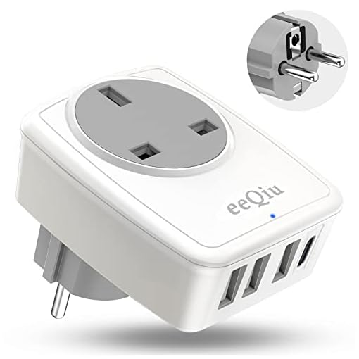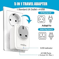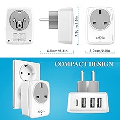 UK to EU Euro Europe Plug Adapter with 3 USB and 1 USB C Ports, eeQiu Euro Travel Adapter 5 in 1 Grounded European Power Plug with USB for France Germany Spain Greece Portugal and More (Type E/F)