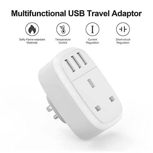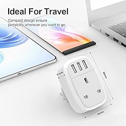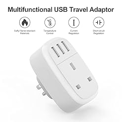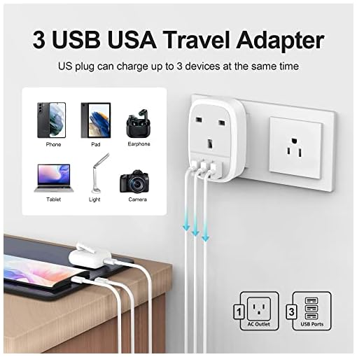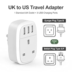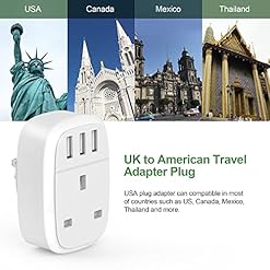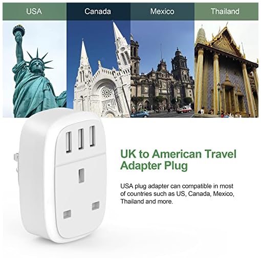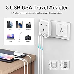 UK to US Plug Adaptor: UK to USA plug adapter has 3 USB ports, a total output of 5V/3.1A and standard UK plug with maximum capacity of 2500W. USA travel adapter does not slip off easily when plugged into the wall.