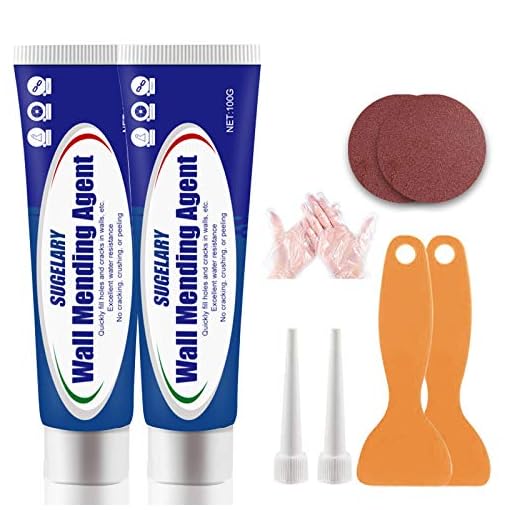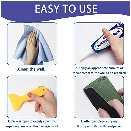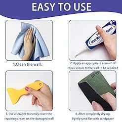 Easy to Use: You will get a simple kit including 2 x wall repair paste (100g), 2 x nozzle extender, 2 x scraper, 2 x disposable gloves and 4 x sandpaper. This wall repairing cream has strong adhesion and quick-drying ingredients. Please wear gloves to squeeze out the white cream and use a free scraper to smooth it evenly. The patch will dry quickly and the repair marks are almost Invisible.