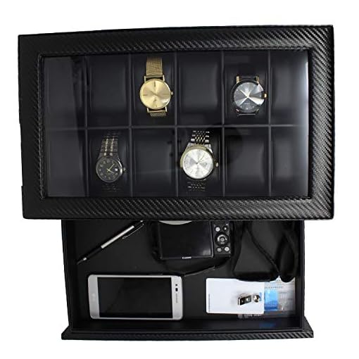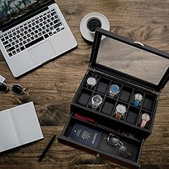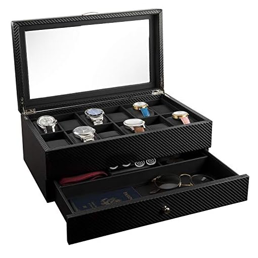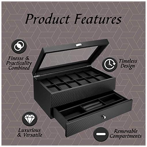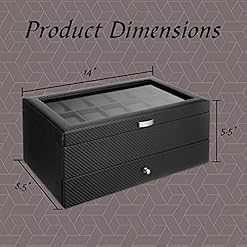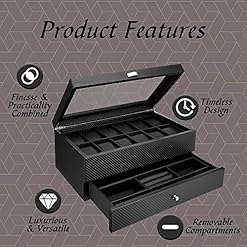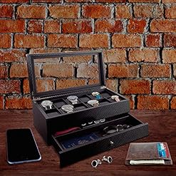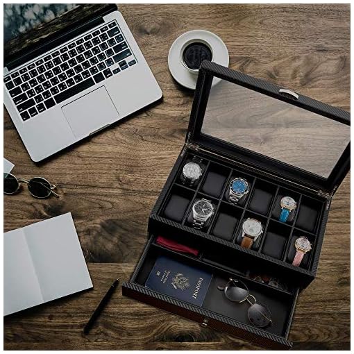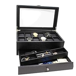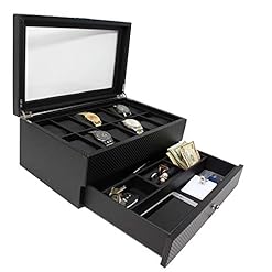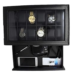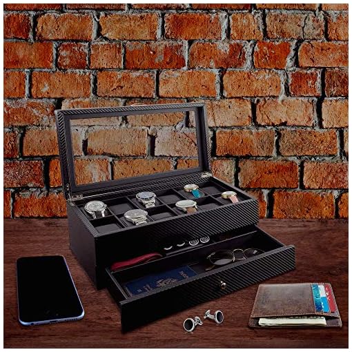 HAUTEROW Mens Watch Box Case Organizer| Faux Leather Watches Jewelry Case| 12 Slots Watch Case storage with Valet Drawer for Sunglasses, Rings, Phone| Sleek Black Color, Glass Top, Carbon Fiber