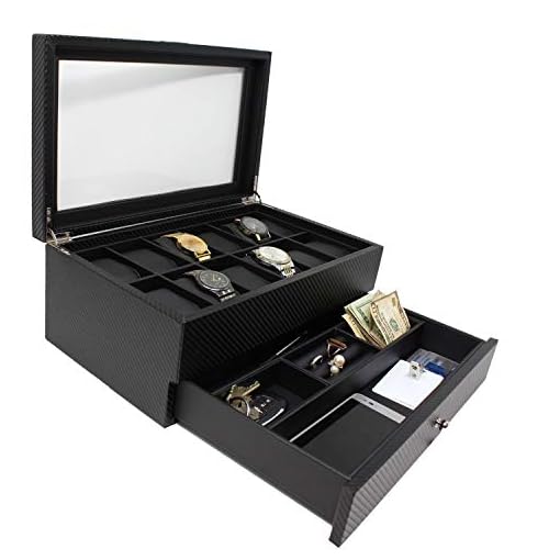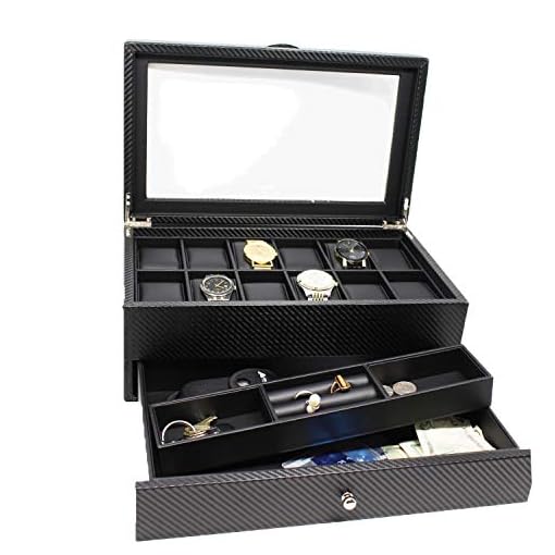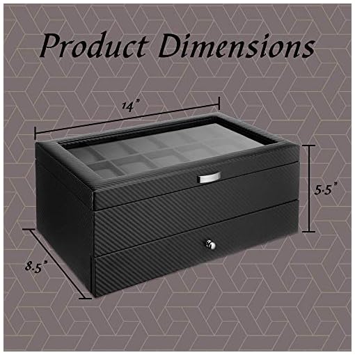 TIMELESS DESIGN CHOICES: The carbon fiber construction, faux leather, and the big glass top, are perfect for any space in your home or office. Place it on display, in your bedroom, or in your closet, and proudly show your prized collection.