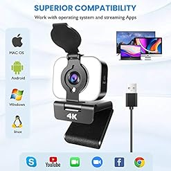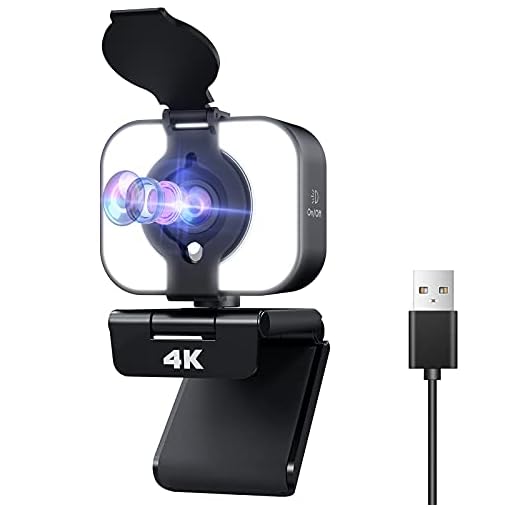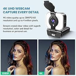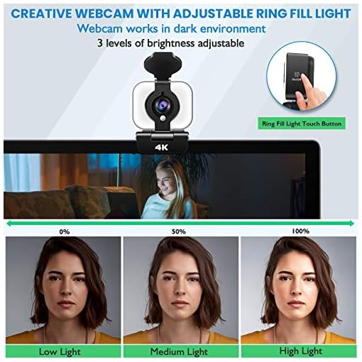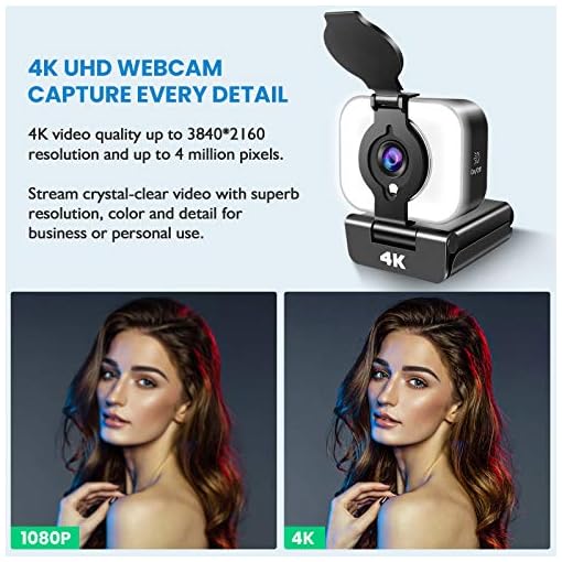 Webcam, USB Webcam with Microphone Privacy Cover 4K UHD Built-in Ring Light Streaming Webcams for PC, MAC, Laptop, Plug and Play Web Camera for Video Calling, Study, Conference, Gaming, Online Classes