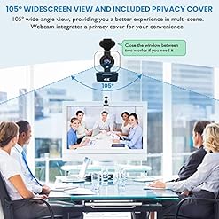 📌 4K Webcam with Privacy Cover & 105° Wide Angle: The privacy cover for the webcams prevents a third-party from using the video lens when it is not in use. It is perfect to help provide security. It also helps to protect the lens from dirt and debris to ensure your video remains clear for the life of the camera. Up and down 180 degrees adjustable, the head 360 degree rotation, 105° Wide angle makes it a wonderful choice for multi-people conferencing, family video calling and recording.